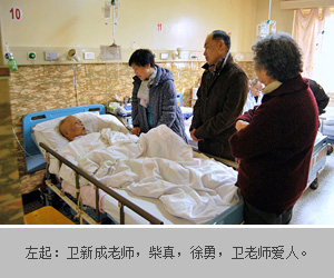 下午两点半,一行人先抵达西苑医院卫新成老师的病房。卫老师卧床不能起来,生活靠老伴刘老师和全时护工照顾。柴真和徐勇表明了此行来意,介绍了尊师基金的设立以及宗旨,并将尊师基金的新年贺卡和3000元补助交给了卫老师的老伴。卫老师神智清醒,能听得懂别人说话,在谈话中说到他生病的经过时会不时地点头,也有交谈的欲望,但发出的声音有些含混不清,需要别人去猜测他的意思。很明显能看出来卫老师今天的情绪比较好,在徐勇对他说“您多听听笑话”时,他很清晰地说“对对对”。