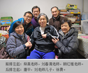 刘春清老师现在与儿子同住,保姆已经放假回家。刘老师看起来精神不错,学生和“学生的学生”去看望她让她很高兴。徐勇和柴真把尊师基金的新年贺卡和本月的善款交给了刘老师。老人很感动,不停地说谢谢。今年的6月15日将是刘老师的80岁生日,我们告诉她届时还会有尊师基金的成员来给她过80岁生日。刘老师记性很好,讲了许多几十年前老生物系有趣的事情,听得大家一片欢笑。