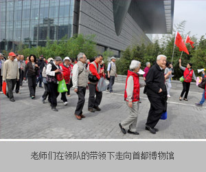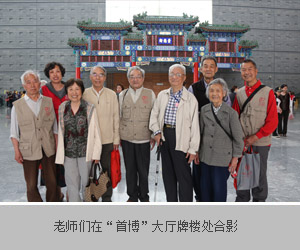 尊师送暖校友情,老友同窗喜相逢。为丰富离退休老师的生活,2014年5月13日,生命科学学院校友尊师基金在学院的协助下,组织学院离退休老师游览首都博物馆,共有72位离退休老师及家属参加了此次游览活动。这次参观是继“离退休教师风采展”、“为老师庆祝教师节”等大型活动之后又一次精心为老师们定制的活动。老师们或听导游讲解,或自己研读文物说明,对中国古代文明表现出浓厚的兴趣,纷纷表示” 这种形式的活动不仅是玩,还学到了知识。”学院54级校友、曾在学院工作40余年的杨端、赵明蓟夫妇五四前夕从美国回来探亲,听说有此次集体活动,特地推掉了与友人的约会,前来参加活动。