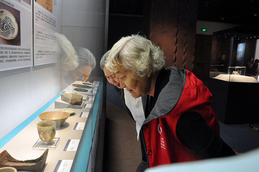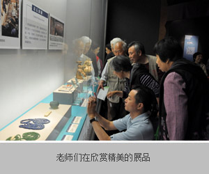 老朋友、老同事久别重逢,相见甚欢,不可胜言。大家一路上说着有趣的故事,谈着自己的家人和生活,笑语连连。5月的北京晴空万里,雾霾早已不见踪影。老师们在首博门前合影留念后,根据参观路线不同分为三组,分别游览中国古代瓷器艺术展、佛教及京剧文化展、古代玉器艺术展等主要展厅。中国瓷器展厅里,导游的讲解生动精彩,青白釉、青花、斗彩、釉里红等中国传统瓷器烧制方法精妙绝伦,水月观音像、凤首壶、葡萄纹杯、天球瓶等中国传统瓷器外形制式源远流长,老师们一边听,一边看,交流讨论,叹为观止。讲解员不但为大家解释展品的工艺和历史,而且带来了有趣的背景故事。一件件展品在这样的注解下变得生动起来,加深了大家的理解。首都博物馆分设十余个展厅,展出各有侧重。刚健肃然的青铜器、温润清透的玉器、华丽精致的金银器,绵绵浓厚的佛教和老北京文化,更有让老师们感觉倍加亲切的书法与绘画。常常有人在自己喜爱的艺术品前驻足,研读品味。在这样一群可爱的老师之中,不仅仅有生命科学各领域的导师学者,还有品味独到的摄影家、书画家和手工艺术家。他们已经步入耄耋之年,桃李满天下,却依然保持着对知识和文化的热情和求索。