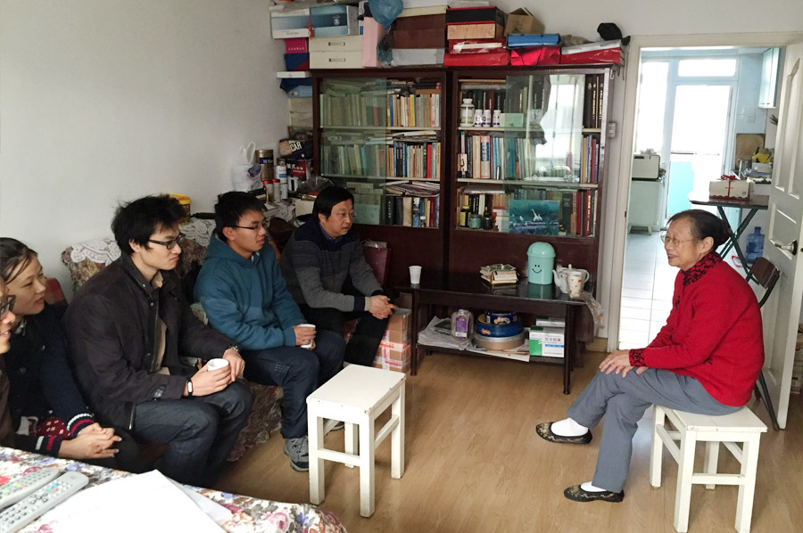 初进门时,迎接我们的便是满面笑容、精神焕发的萧老师。在递上贺卡送上祝福后,众人即落座交谈。大家首先关切地询问了萧老师此前患病的康复情况,随后又谈及了老人退休后的晚年生活。萧老师饶有兴趣地介绍了自己的兴趣爱好——贴画与布艺。在萧老师的家中,挂满了她自己用树叶和鲜花等植物标本制作的艺术作品,同时也到处摆放着其老伴汪老师自己拍摄的各种照片。萧老师还给我们展示了她最近正在做的绢花手工作品。从精美的花朵中,众人仿佛看到了老人乐观向上的心态和永远年轻的精神。萧老师和汪老师还给大家讲述了很多他们年轻时候的故事,从初中的相识说到结婚后从北京到汉中又重回北京的经历,两位老人的叙述始终平和如一,丝毫没有抱怨也没有不忿,显得那么安详。