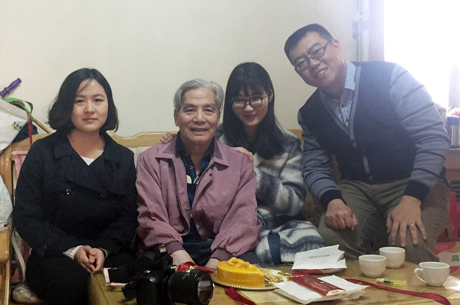 一行人刚步入房门,即受到了梁崇鋕老师及其家人的热烈欢迎。刘超老师代表尊师基金向梁老师致以诚挚的生日祝福并送上盛满全体校友捐赠人心意的生日贺卡。众人落座后,大家与梁老师拉起了家常。梁老师谈及年轻时代的往事,感慨时光飞逝,勉励在座的年轻人要珍惜时间,加强锻炼身体。随后众人便开始了健康话题的讨论。梁老师虽已八十高龄,看起来仍神采奕奕体格硬朗。在被问其秘诀时,梁老师笑言,每天中午都会打一小时乒乓球,常年如此从未间断。