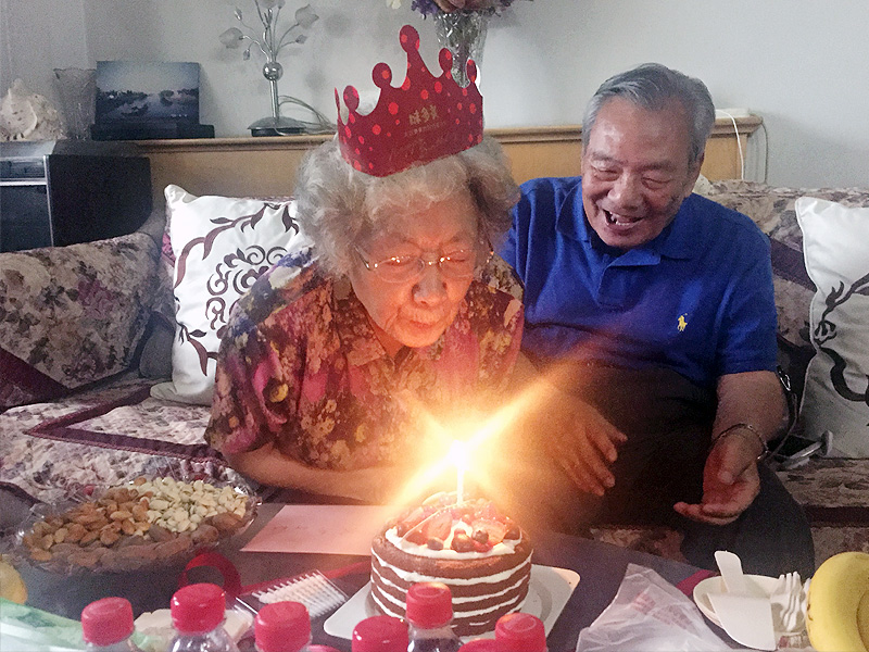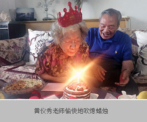 黄老师是学院校友会1954级理事,同时也是朱圣庚老师的夫人。下午3时许,老师和同学们来到黄老师家楼下,见朱老师代表其夫人早已等候在门外迎接大家,同学们特别感动。来到黄老师家中,大家递送了生日贺卡和蛋糕,黄老师非常开心,热情地招待大家吃点心。黄老师今年80岁,朱老师83岁,夫妻二人身体康健,精神饱满,和乐慈祥中亦不失大家风范。黄老师十分关心学校的学习活动,校友会刘超老师向两位老师介绍了近期丰富的校友活动和正在进行的“生命情怀”夏令营,两位老师感到很欣慰。朱老师询问了几位同学的学习科研状况,对同学们的成长表示了关心。随后,校友们将蜡烛点亮,唱起生日歌,朱老师还主动要为黄老师拍照录像,气氛其乐融融。